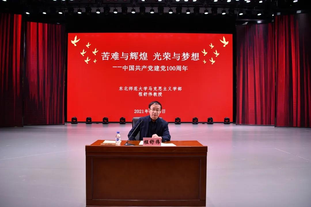 为进一步教育引导全校师生深刻把握党史学习教育的重大意义,学懂弄通做实党的创新理论,不断提高政治判断力、政治领悟力、政治执行力,切实增强开展党史学习教育的思想自觉、政治自觉和行动自觉,5月19日,我校召开党史学习教育专题辅导报告会暨理论学习中心组学习(扩大)会,邀请东北师范大学马克思主义学部教授、博士生导师程舒伟作“苦难与辉煌 光荣与梦想”专题辅导报告。