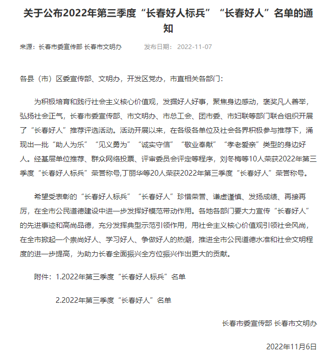 近日,由长春市委宣传部、市文明办、市总工会、团市委、市妇联等部门联合组织开展的“长春好人”推荐评选活动结果揭晓。经个人申报、基层单位推荐、群众网络投票、评审委员会评定等程序,我校初等教育学院王颖老师荣获2022年第三季度“长春好人”荣誉称号。