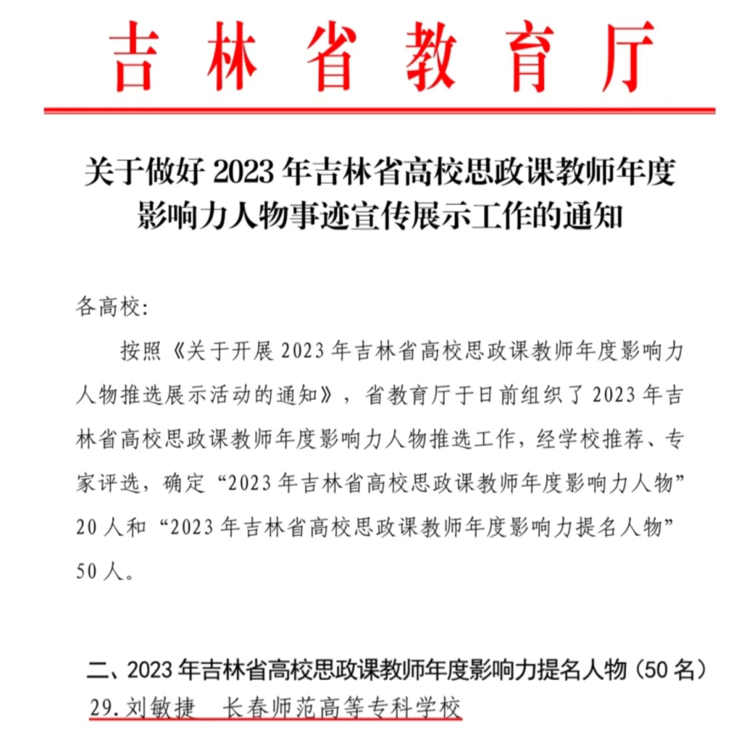 近日,吉林省教育厅公示2023年吉林省高校思政课教师年度影响力人物推选结果。经学校推荐、专家评选,我校思政部刘敏捷老师入选2023年吉林省高校思政课教师年度影响力提名人物。